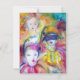 Três personagens caprichosos e legais do Teatro Veneziano: Harlequin, Pierrot e Colombine: Máscaras venezianas elegantes e vibrantes, design artístico com fantasia floral colorida, folhas de flores voando em faíscas douradas, cores amarelo brilhante, laranja, vermelho, rosa, fúcsia, violeta, verde, marrom e floreios roxos. Pintura original em aquarela com folha dourada e prateada inspirada na Comédia da Arte (Commedia dell'arte) e Carnaval de Veneza. Design Gráfico Digital por Bulgan Lumini - Baldesign3d (c)