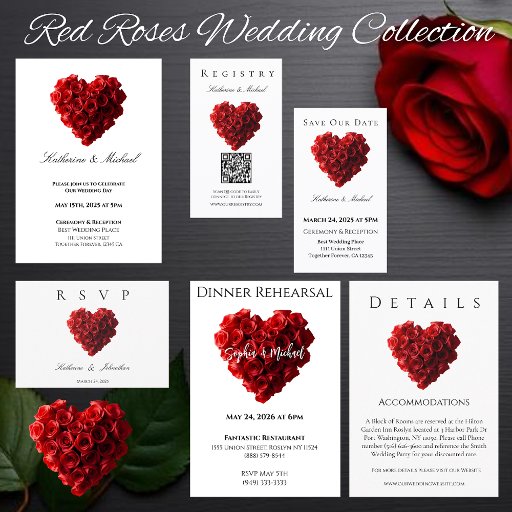 The bold red roses create a stunning contrast against the dark backdrop, while elegant typography completes the look of refined luxury. This romantic heart of roses design symbolizes deep passion and everlasting love, setting the perfect tone for your special day.