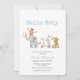 Cute adorable jungle safari animals baby shower theme, blue elephant baby shower theme, little peanut baby shower theme, design feature whimsical watercolor musical animals parade, little baby elephant, tiger, rabbit, bear with musical instrument and the text " Hello Baby " on the white and blue background. you can customize your special unique text and color.
