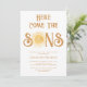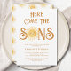 It features the text "Here Come The Sons" in stylish typography with a cute yellow watercolor smiling sun.
