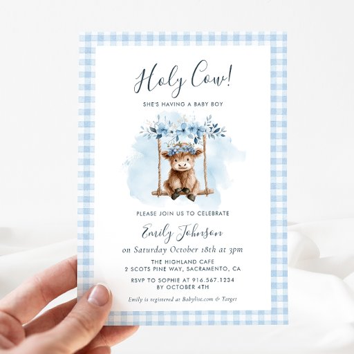 Celebrate the upcoming arrival of a precious baby boy with this charming “Holy Cow!” baby shower invitation. Featuring an adorable watercolor baby calf sitting on a swing, surrounded by soft blue florals and a classic blue gingham border, this invitation is perfect for a sweet western or farm themed baby shower.