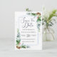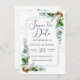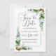 O Elegante Casamento Greenery de inverno Salve o Convite de Data. Esta design apresenta um quadro de efeito de fosco decorado com folhas e bagas de Holly, cones de pinho e folhagem verde.