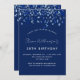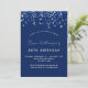 Um moderno, elegante e convite. Um fundo azul marinho decorado com confete azul. Personalize e adicione um nome e detalhes. Texto branco.
