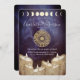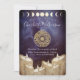 Este convite de festa místico e encantador apresenta um fundo de design celestial com uma imagem do céu noturno, estrelas e as fases da lua impressas perto do topo. Uma roda de horóscopo dourada é colocada no centro com velas derretidas e pó de brilho dourado espalhados pela parte inferior. A data de nascimento e o signo do zodíaco são impressos abaixo do nome da amostra. O verso do convite apresenta um fundo celestial correspondente.