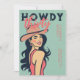 Um modelo convite de festas divertido para mulheres com um tema ocidental retrógrado, com um esboço ao estilo poster de uma bela mulher vestindo um chapéu de vaquinha, em uma pose lisa, com o título "howdy 30", com um esquema colorido cor-de-rosa, verde e marinho. Uma aniversário de 30 anos divertida convidada para uma mulher no seu trigésimo aniversário.