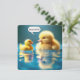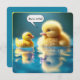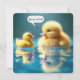 Um patinho liso e um pato de borracha amarelo estão flutuando lado a lado em uma superfície azul calma e brilhante. Todo o texto pode ser alterado.