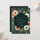 A dramatic and romantic atmosphere is created by lush botanicals set against a deep hunter green background. Delicate anemones and soft blooms in shades of painterly coral, blush pink, and creamy ivory provide a soft, luminous contrast. Muted teal foliage is woven throughout the arrangement, perfect for an elegant and artful union.