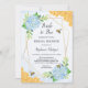 Estes convites de chá de panela apresentam um design floral de aquarelas com flores azuis de hydrangea, folhas, abelhas melíferas, favos de mel e uma estrutura geométrica falsa de ouro. Produtos correspondentes também disponíveis.