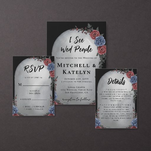 Bring the supernatural to your wedding night with this frightful " I See Wed People" wedding invitation. With it's dark color scheme, coffin and moody floral arrangements, it's the perfect stationary to prepare for a haunted Halloween wedding extravaganza. Perfect for couples who plan to tie the knot in the spooky season or for anyone who loves a gothic twist.