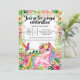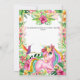 Um bonito unicórnio mágico cor-de-rosa com longos cabelos dourados, azuis e cor-de-rosa está sentado num cenário de floresta cheio de lindas flores tropicais brilhantes e coloridas. As flores amarela, rosa, laranja e amarela e frangipani formam um belo quadro à volta da princesa e uma ave-solteiro é vista voando para a esquerda. A parte de trás tem a mesma ilustração vibrante da frente. Personalize as modelos para se adequarem ao aniversário de sua filha, neta, afilhada, sobrinha ou irmãs. Sua garotinha ficará encantada.