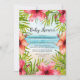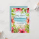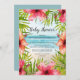 Chá de fraldas floral neutro de cor aquosa tropical com fundo de praia enquadrado por flores de hibisco e folhas de palma. O lado inverso é um azul oceânico sólido. Personalize com os detalhes do seu chá de fraldas.