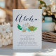Aloha! Dando uma festa de boas-vindas de casamento com tema havaiano ou luau antes do grande dia? Convide amigos e familiares com nossos convites de jantar de boas-vindas de casamento fofos, apresentando um buquê de flores tropicais em tons elegantes de praia, e "aloha" em letras de caligrafia moderna e elegante. Os cartões são virados para um aqua sólido no verso.