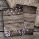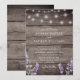Convite de casamento com impressão em madeira rústica com lavanda e luzes de corda brancas com código QR no verso para responder.