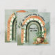 Arco boêmio com arco-íris em tons de verde e laranja. Uma panela de ouro e trevo na base, e borboletas verdes voando ao redor.
