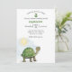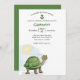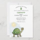 Este convite de festa personalizado apresenta uma ilustração de tartaruga bebê fofa. Uma pequena tartaruga verde é colocada no canto inferior esquerdo com um sol brilhando sobre ela. É bom para um chá de bebê ou festa de aniversário de criança. O nome e a idade de exemplo são impressos em uma fonte verde.
