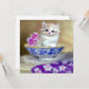 Cartão com um gatinho branco fofo! O gatinho de olhos azuis fica em uma tigela azul com flores cor-de-rosa. Um cobertor com flor púrpura é cortado na frente. Um presente maravilhoso para amantes de gatos e entusiastas de arte vitorianos!