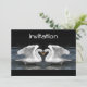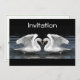 Uma fotografia da natureza foi aumentada digital para criar uma imagem invertida de uma cisne branca muda. Há uma forma do coração criada onde as duas cisnes se encontram. A cisne branca está contra as ondinhas na água azul e em um fundo preto.