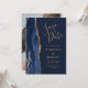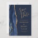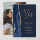 Este elegante e moderno salve a placa de data apresenta um marinho azul de aquarela agata borda cortada com falso brilho dourado. O texto dourado aparece sobre um fundo azul marinho. Substitua facilmente a imagem de amostra no verso por uma foto vertical da futura noiva e noiva.