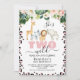 Impressão de Chita Rosa Ela é o safari de Duas Garotas de segundo aniversário Selvagem Convidando Rapariga dois convites de aniversário selvagens apresentando um padrão de leopardo ou impressão de Chita ao redor da borda e um arranjo floral tropical no topo. Excelente para um safari duas festas de aniversário de segunda menina.