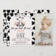 Impressão da vaca branca negra Foto do primeiro aniversario da vaca sagrada Convite para primeiro aniversario de vaca sagrada O convite para de vaca sagrada apresenta uma vaca branca e negra fofa, algumas flores cor-de-rosa, um arco de rosa claro, um padrão de impressão de vaca negra e a foto de sua garotinha. Excelente para alguém que procura por uma vaca negra e branca, design de convite de aniversário temático.