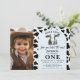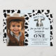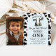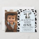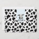 Impressão azul de vaca preto Foto do primeiro aniversario de vaca Sagrado Convite para vaca Doce Primeiro convite de aniversário com um arco azul claro, padrão de impressão de vaca negra, vaca branca e negra fofa e uma foto. Esse convite de primeiro aniversario de vaca sagrada é ideal para quem procura um design de convite preto e branco com tema de vaca.