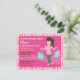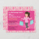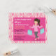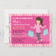 Para as meninas, especialmente adolescentes, uma ideia divertida será planejar uma festa de caça aos pequenos tesouros e jantar em um restaurante no shopping! Este convite feminino tem uma garota bonita com o cabelo amarrado em uma cauda de pônei vestida confortavelmente para caminhar no shopping. Ela está segurando dois sacos de compras. Um padrão de impressão zebra rosa e branca para fundo.