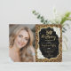 Elegante convite floral feminino para o 50º aniversário com sua foto. Design preto de vidro com ouro brilhante falso. Possui impressão de leopardo animal, rosas brancas, fonte de script e confete. Perfeito para uma festa de comemoração de na moda adulto. Personalize com seus próprios detalhes. Pode ser personalizado para qualquer idade! Impressos convites Zazzle ou modelo de impressão digital instantânea para download.