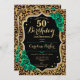 Elegante 50º convite de aniversário com sua foto no fundo do cartão. Design verde-preto com uma impressão de leopardo animal e ouro brilhante. Recursos esmeraldas rosas verdes, fonte de script e confetti. Perfeito para uma festa de comemoração de na moda adulto. Personalize com seus próprios detalhes. Pode ser personalizado para qualquer idade! Impressos convites Zazzle ou modelo de impressão digital instantânea para download.