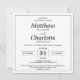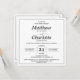 Roteiro elegante convite físico ou digital impresso em branco com letras pretas e um quadro delicado. Personalize-o com os nomes, apelidos, data, local, registro e RSVP do Sr. e Sra. A parte traseira pode ser personalizada com as iniciais do casal.