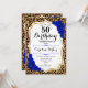 Elegante convite de 50 anos femininos com sua foto na parte de trás do cartão. Design de vidro com impressão de leopardo animal e ouro brilhante falso. Apresenta rosas azuis reais de safira, fonte de script e confetti. Perfeito para uma festa de comemoração de na moda adulto. Personalize com seus próprios detalhes. Pode ser personalizado para qualquer idade! Impressos convites Zazzle ou modelo de impressão digital instantânea para download.