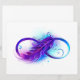 Símbolo infinito com uma bela pena pintada em cores roxas e azuis brilhantes sobre fundo branco.