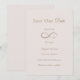 Este lindo convite de casamento Save The Date apresenta o clássico símbolo do infinito para unir os nomes da noiva e do noivo, simbolizando o amor eterno. A cor do fundo foi definida como rosa claro, mas sinta-se à vontade para alterá-la para uma cor diferente para combinar com o tema do seu casamento.