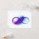 Símbolo do infinito com uma bela pena pintada em cores vibrantes roxas e azuis sobre um fundo branco.