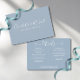 Um elegante cartão de informações de detalhes de casamento personalizado com seus detalhes especiais em tipografia de na moda e seus nomes e data de casamento no verso em um fundo azul empoeirado. Você pode personalizar o fundo para a sua cor favorita do tema do casamento. Projetado por Thisnotme©
