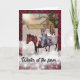 Inverno no cartão fazenda rebatível xadrez vermelha e neve com 4 cavalos na neve com feixe de sol