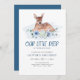 O doce convite de aniversário "veado está virando um" com flores azuis de aquarela com verde e veado de bebê pintado manualmente. Você pode personalizar o texto, o estilo da fonte, a cor e o tamanho em frente e atrás do convite.