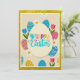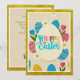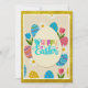 The Festive Egg Greeting: A playful design filled with colorful patterned eggs, pink tulips, and daisies, centered around a whimsical "Happy Easter" message.