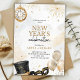 Invitation for a New Year's celebration with a clock, fireworks, top hat, mask, and balloons. Elegant gold and silver tones convey a festive atmosphere.