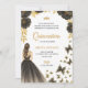 Invitation for a Quinceañera with elegant black and gold floral and butterfly design. Features a girl in a black gown, conveying a sophisticated celebration theme.