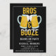 Este convite de despedida de solteiro para casamento é perfeito para os rapazes, sendo divertido e descolado. Apresenta canecas de cerveja pintadas à mão em amarelo, branco e azul tilintando com a frase "Bros and Booze" (Amigos e Bebida), sobre um fundo com padrão abstrato preto. É moderno, masculino e divertido; o design perfeito para os seus amigos.