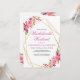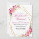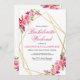 Flores em aquarela boho rosa claro e branco dentro de uma moldura geométrica dupla dourada apresentam floreios botânicos e de frutas. Personalize este convite de despedida de solteira com suas próprias cores e fontes ou mantenha esta tipografia popular como está para sua conveniência. Misture e combine com outros itens desta linda coleção de casamento.