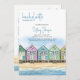 Convite de Fim de Semana de Despedida de Solteira na Praia com Itinerário. Design em aquarela apresentando uma fileira de cabines de praia coloridas e pintadas à mão na areia dourada à beira-mar, desfrutando de vistas para o mar e um céu azul de verão. O modelo está configurado para você adicionar detalhes do fim de semana e do organizador com o itinerário do fim de semana no verso. Se precisar fazer ajustes nos títulos ou no espaçamento, por exemplo, clique em "editar usando a ferramenta de design".