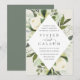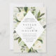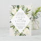 Nosso convite para o casamento de Ivory Bloom rodeia os detalhes do dia do seu casamento com uma estrutura geométrica moderna em forma de diamante de verde-aquarela pintada, folhas de eucalipto, folhagem botânica, rosa branca e flores de pénia.