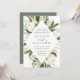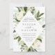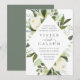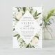 Nosso convite para o casamento de Ivory Bloom rodeia os detalhes do dia do seu casamento com uma estrutura geométrica moderna em forma de diamante de verde-aquarela pintada, folhas de eucalipto, folhagem botânica, rosa branca e flores de pénia.