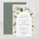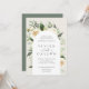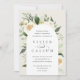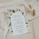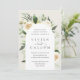 Nosso convite para o casamento de Ivory Bloom rodeia os detalhes do seu dia de casamento com um belo arco de cor d'água pintada, folhas de eucalipto, folhagem botânica, rosa branca e flores de pénia.