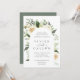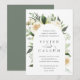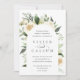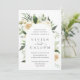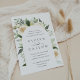 Nosso convite para o casamento de Ivory Bloom rodeia os detalhes do seu dia de casamento com um belo arco de cor d'água pintada, folhas de eucalipto, folhagem botânica, rosa branca e flores de pénia.