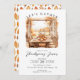 Este convite de Ação de Graças apresenta uma mesa com uma cena de outono ao ar livre com as palavras "vamos juntar". O convite é simples e elegante, com fundo branco e texto preto.
