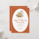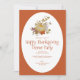 Um convite de jantar de Ação de Graças desenhado com folhas coloridas de outono e uma abóbora em aquarela, em um fundo laranja brilhante e branco com texto de convite: Data, Hora e detalhes de confirmação de presença. O verso na cor laranja da colheita correspondente. Para personalizar, basta substituir o texto de exemplo usando nosso modelo passo a passo.