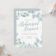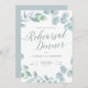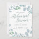 Um convite elegante para jantar de ensaio de casamento, que complementaria um casamento de inverno, Este design apresenta uma moldura de folhas de eucalipto azul poeira aquarela com "jantar de ensaio" em fonte de caligrafia moderna azul poeira. Personalize com detalhes do seu evento em fonte cinza. O verso é em azul poeira sólido.