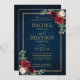 Convite de jantar de ensaio floral em aquarela vermelho borgonha rosa naval com modelo de RSVP com moldura dourada e letras douradas com folhagem botânica verde e folhas de eucalipto em fundo azul naval. Este lindo design fácil de personalizar pode combinar facilmente com as cores, estilos e tema do seu casamento e é uma escolha perfeita para casamentos de outono, verão ou inverno. Você pode encontrar mais designs correspondentes na minha loja ou entrar em contato comigo se precisar de ajuda na personalização do design.